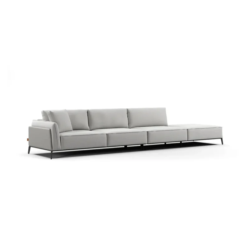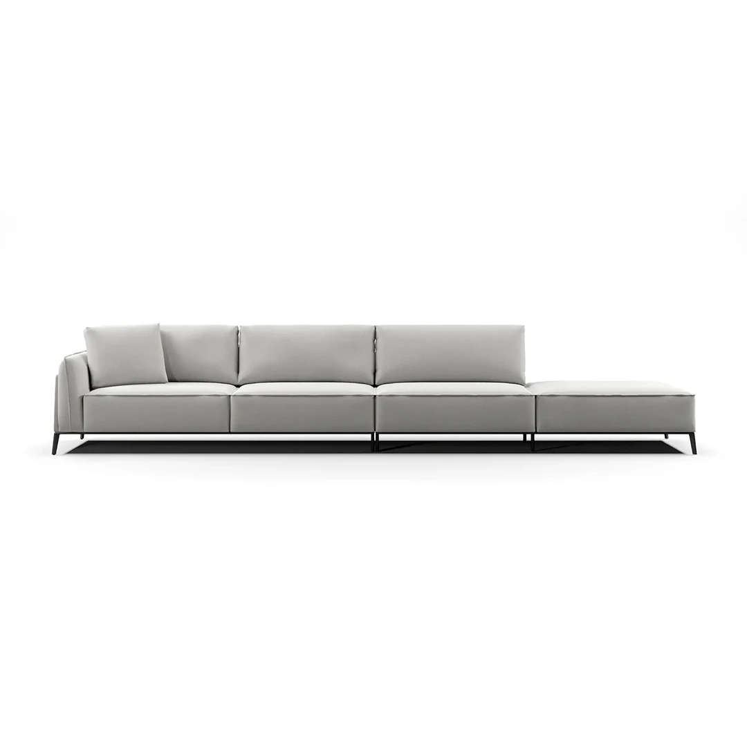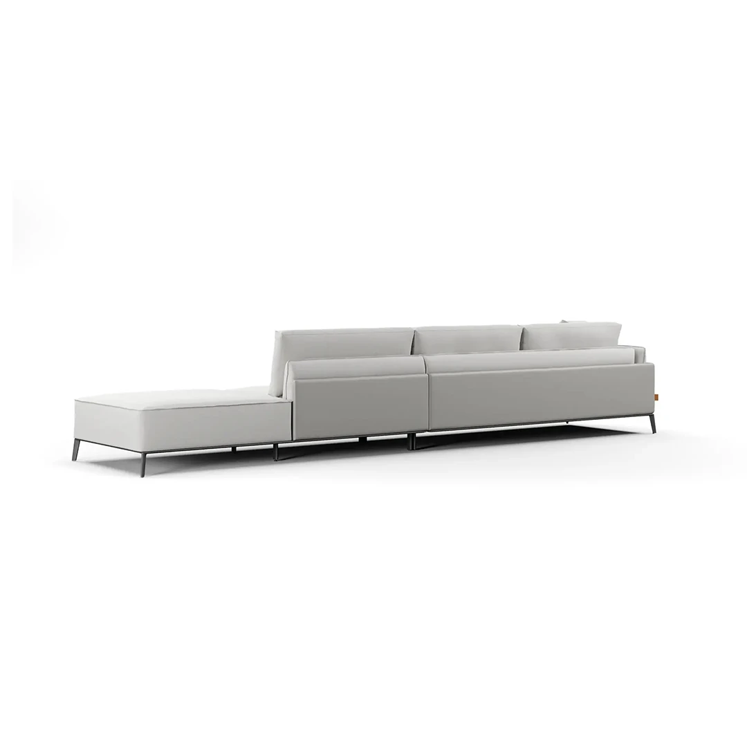 Assento com almofada fixa costurada com fole composê. Encosto e braço fixos costurados com fole composê e caixa com costura em pesponto simples. Almofada de encosto solta e decorativa de braço 55x45cm costurada com fole. Base em aço carbono nos acabamentos pintura MTX e metalizada.
